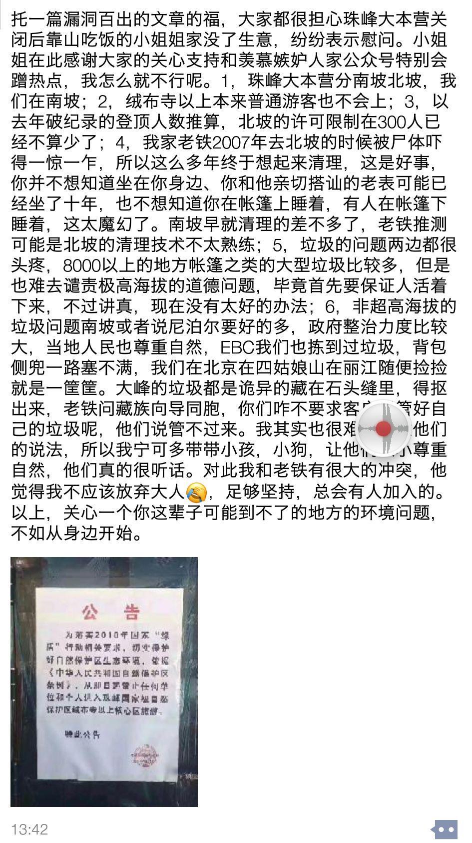 右图是一条热门的伴侣圈,源自一位在珠穆朗玛峰北坡开店的蜜斯姐,显然她受了一些误会。不外那段话的信息量略大啊: