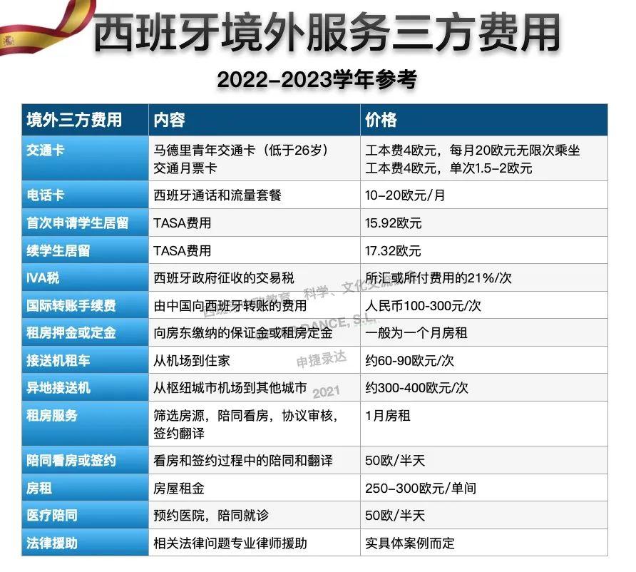 一般来说,西班牙每年的本科和硕士膏火在4000-7000欧元摆布,博士在300-600欧元摆布。生活费在每月500-1000欧元摆布。而其它留学前后产生的费用,叫做三方费用。