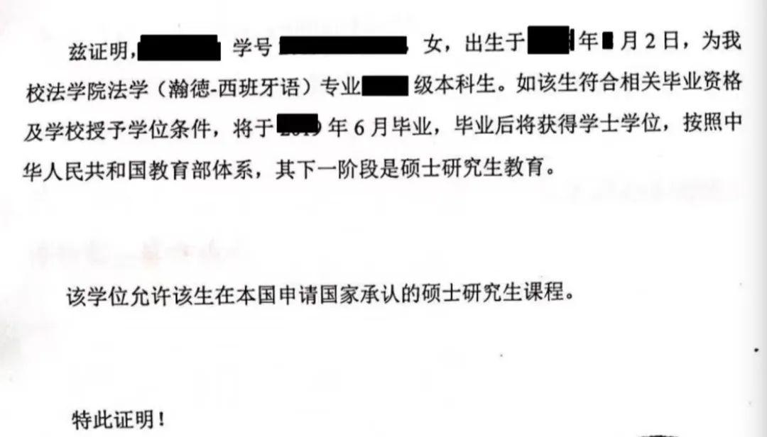 若是在之一批和第二批登科期间暂时无法供给更高学历的结业证书,能够先找院校开具在读证明。需公证双认证且翻译为西班牙语/英语。