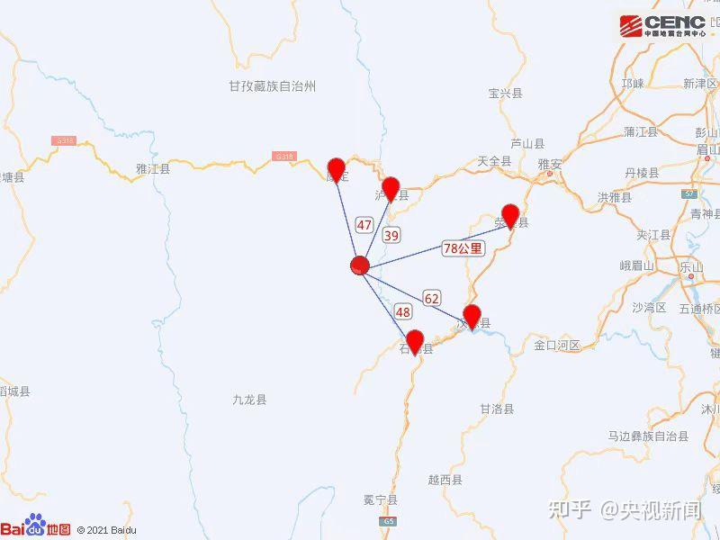 周边县城:震中距泸定县39公里、距康定市47公里、距石棉县48公里、距汉源县62公里、距荥经县78公里,距甘孜藏族自治州52公里,距成都会226公里。
