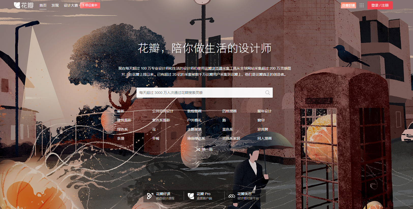 3.花瓣花瓣做为国内更大的设想灵感来源网站,对无数设想类学生、新人设想师供给了很大的帮忙