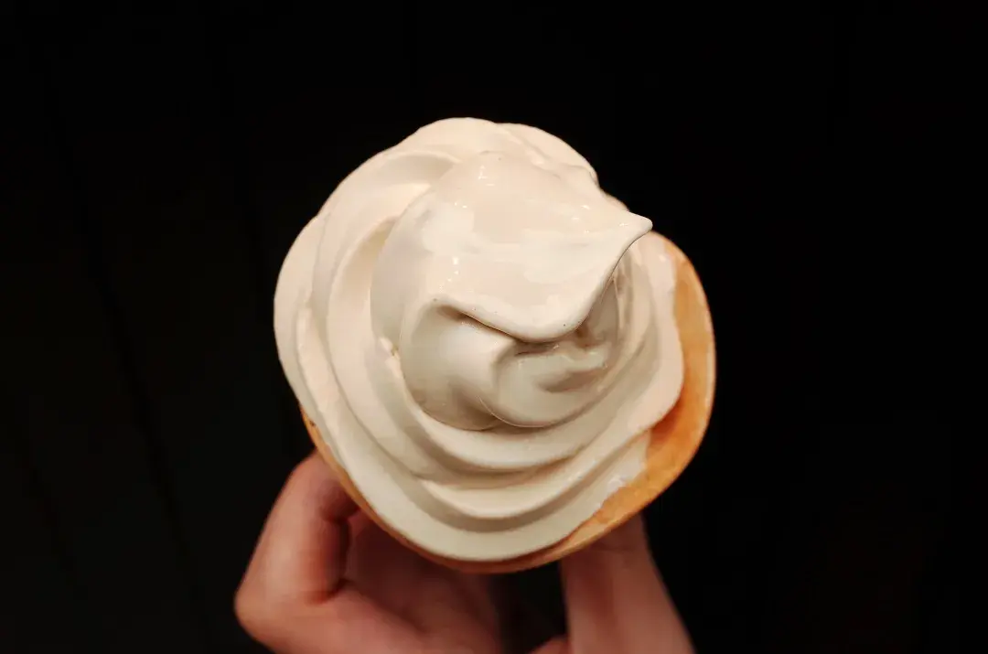 外皮比力薄脆,咬开以后发现内馅比力单个,就是普通俗通的香草冰激凌。