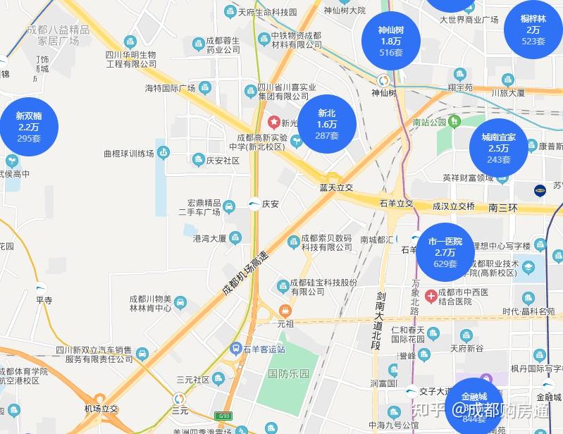 若是你拉近一点看北美洲长廊周边有三环路、成渝环线高速和机场高速三条道路包抄。新区西侧与武侯新城隔了承平寺,与中央商务区被新园街道社区和成昆线划开来。
