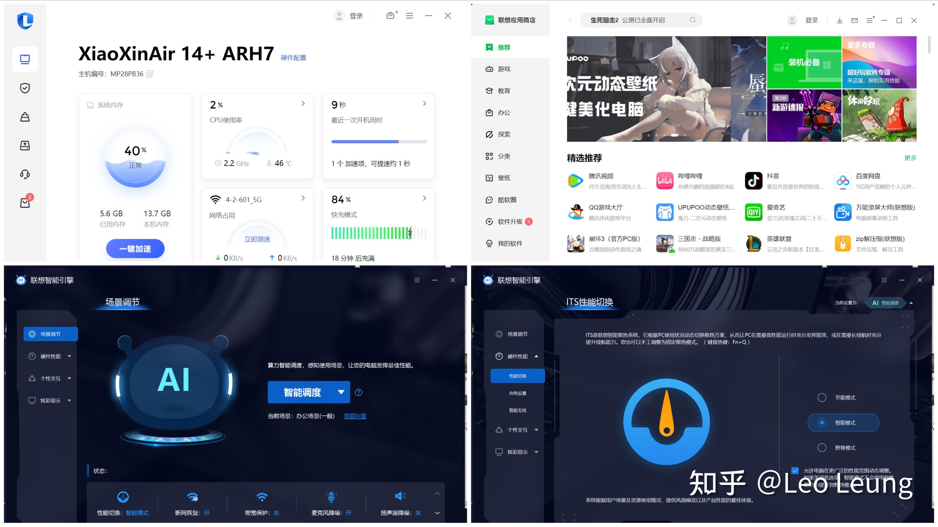小新Air14 Plus原生系统自带电脑管家和软件中心。而且还搭载了TNUMBERA51的智能引擎,纵使可以快速的设置多种功用开关,好比WiFi、蓝牙、麦克风等,还能自定义调整功耗设置,满足差别利用场景的高效能需乞降长续航需求。