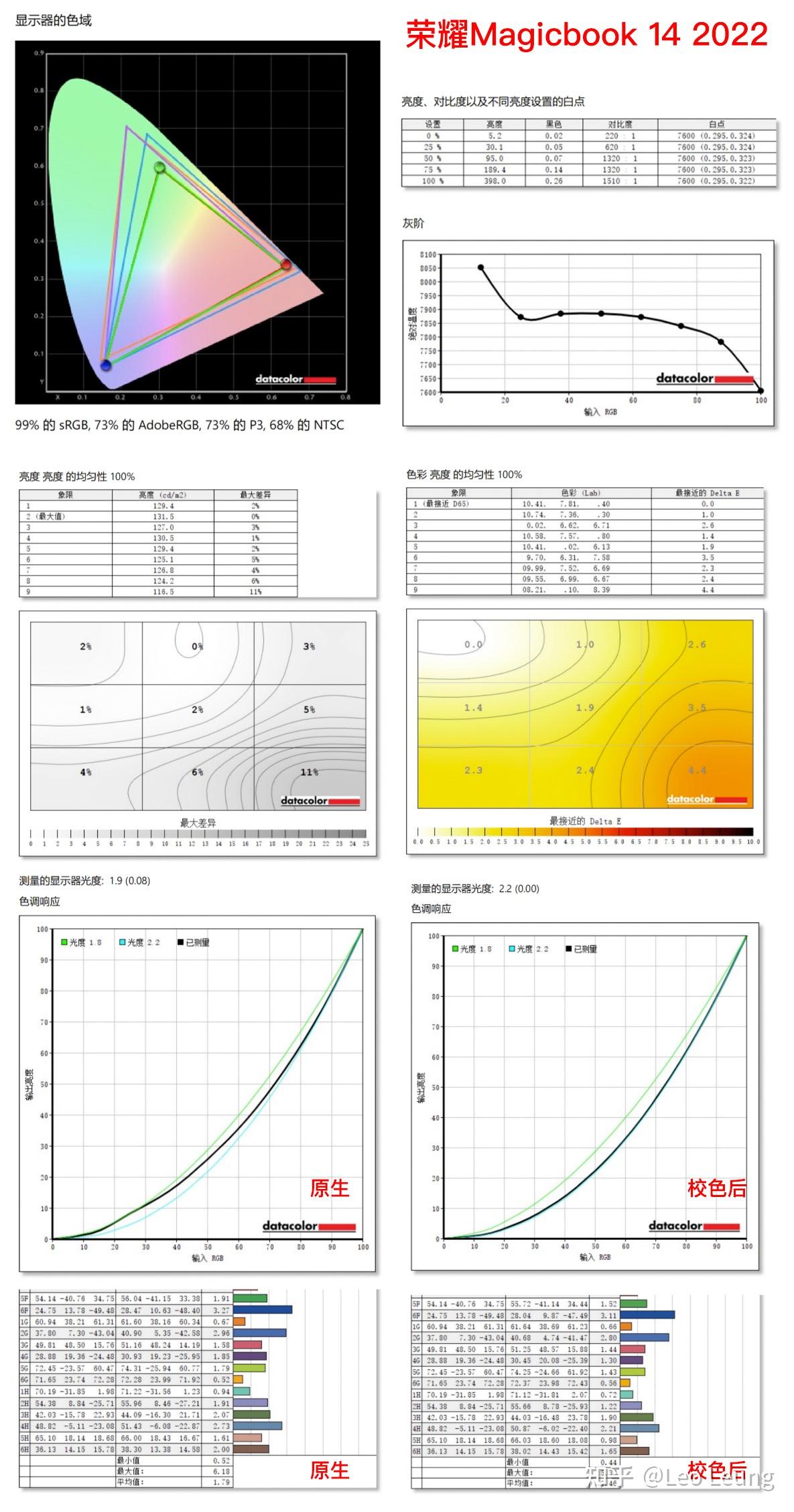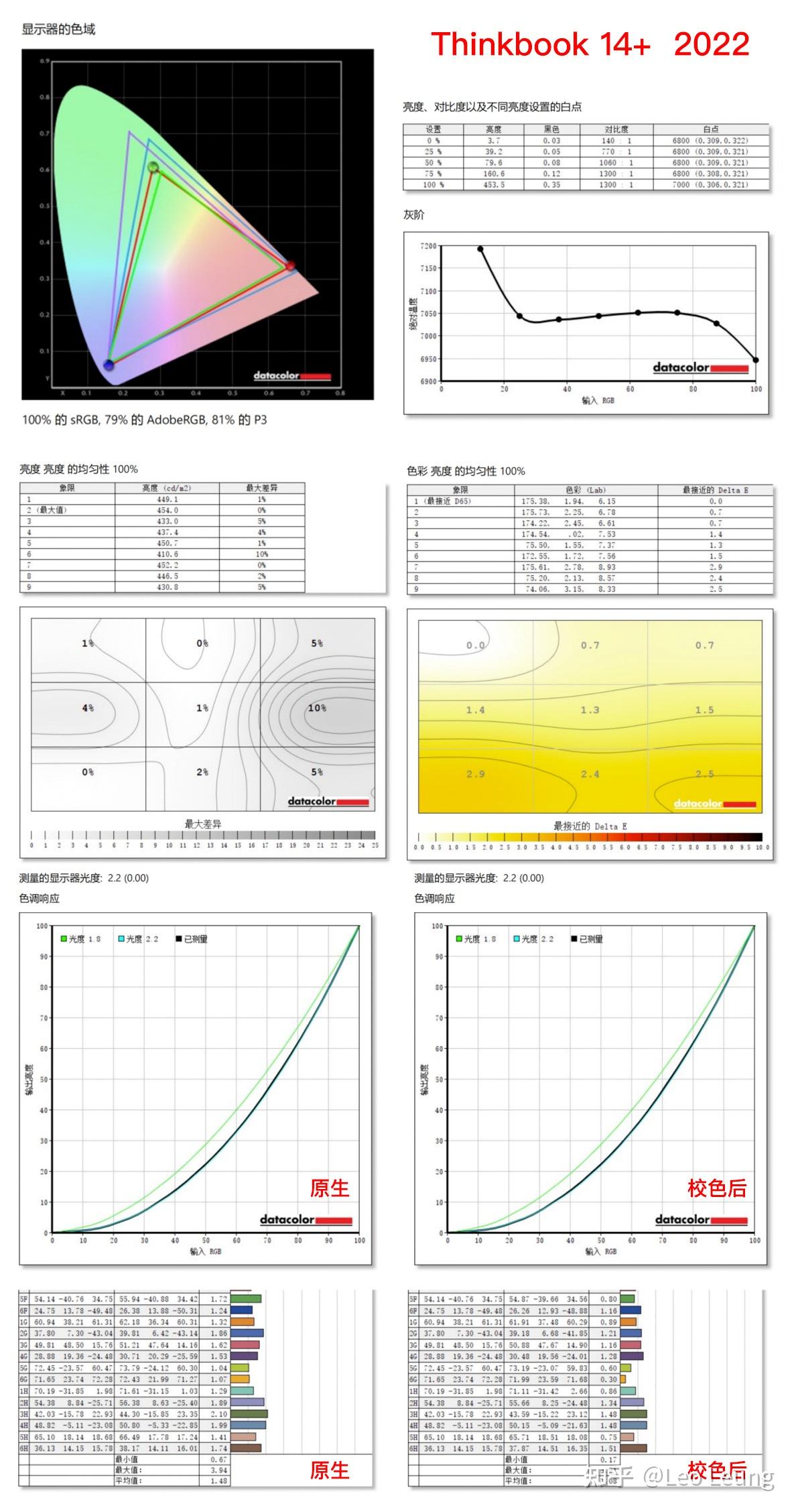 ThinkBook14+那块屏幕的色域笼盖为100%的sRGB, 79%的AdobeRGB, 83%的 P3。100%SDR亮度453nit,比照度1300:1,。白点值总体色温略微偏冷一点点。原生伽马曲线2.2,十分尺度。色彩亮度平均性整体表示非常优良,更大值仅△E 2.9。黑白亮度整体表示同样极好,仅有一个区域超越10%。48 *** 准测试,原生屏幕更大差值△E 3.94(蓝色系),均匀色准△E 1.48。校色后更大值减小为3.21,均匀色准到达了△E 1.08 。ThinkBook14+那块屏幕的色彩整体表示不但出彩,原生屏幕就能够满足听觉构造设想相关专业的用户。