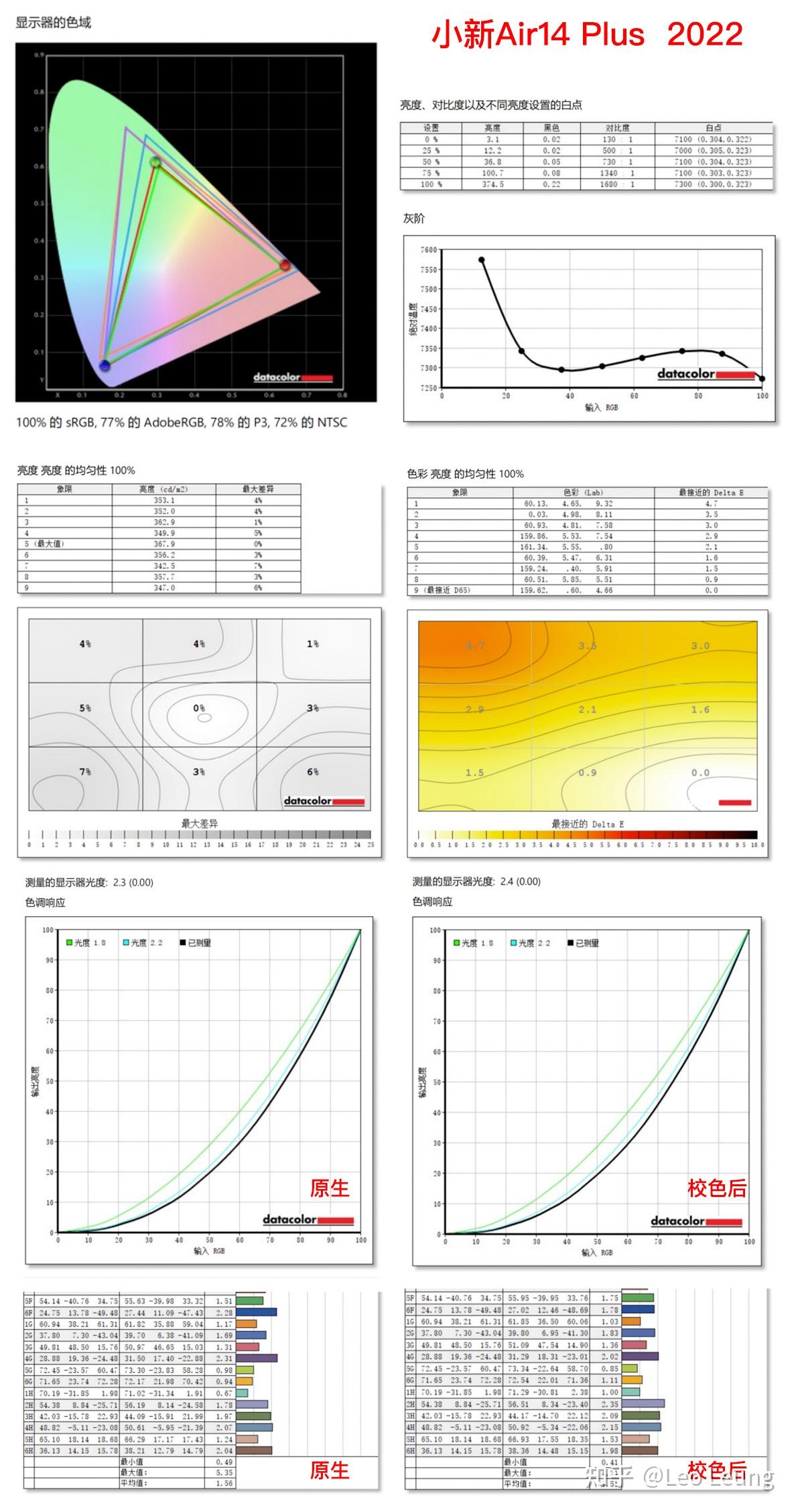 小新Air14 Plus那块屏幕的色域笼盖为100%的sRGB, 77%的AdobeRGB, 78%的 P3。100%SDR亮度375nit,比照度1680:1,。白点值总体色温略微偏冷一点。原生伽马曲线2.3。色彩亮度平均性整体表示极好,更大值仅△E 4.7。黑白亮度整体表示十分极好,没有一个区域超越10%。48 *** 准测试,原生屏幕更大差值△E 5.35(蓝色系),均匀色准△E 1.56。校色后更大值减小为4.21,均匀色准到达了△E 1.51 。小新Air14 Plus那块屏幕的色彩整体表示优良,原生屏幕也能够满足听觉构造设想相关专业的用户。