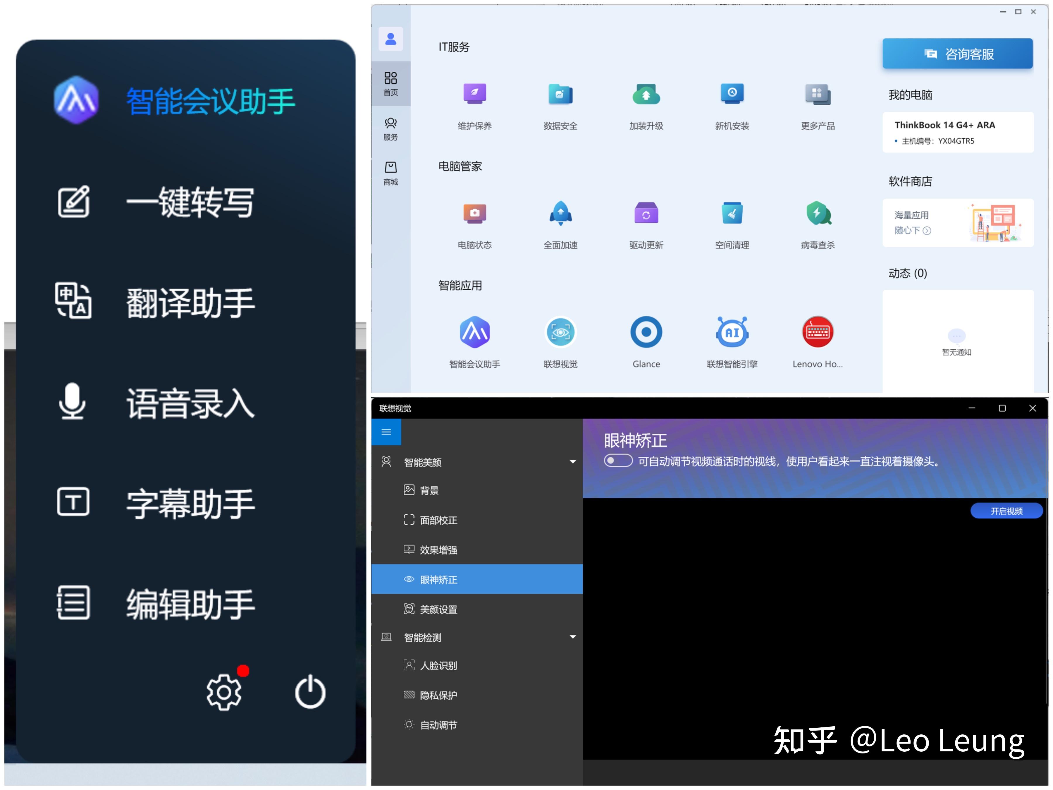 ThinkBook14+原生系统除了电脑管家和软件中心以外,还增加了多种商务功用。好比智能会议助手,视频听觉设置,IT办事等。