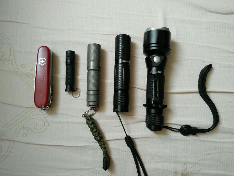 以上是拿fenix做为参考,其他品牌手电类似,手上没有大头手电,就给各人上一张大小比照图,别离是:瑞士军刀,aaa手电[9],aa手电,18650小曲,中头手电;