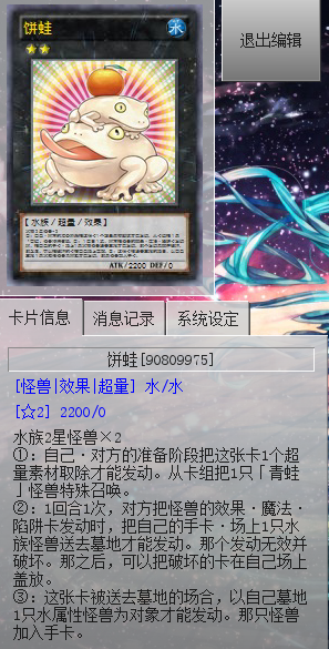 青蛙的最强末端。区区2阶拥有2200的打点,极其反常的流天+攫取效果,在青蛙卡组中1下和3下又意味着两个赚卡点。让它愈加泛用的处所在于它能够被龙神鲨(4*2水属性)拉出来,使得一部门和2星超量无缘的卡组都能够外挂它。