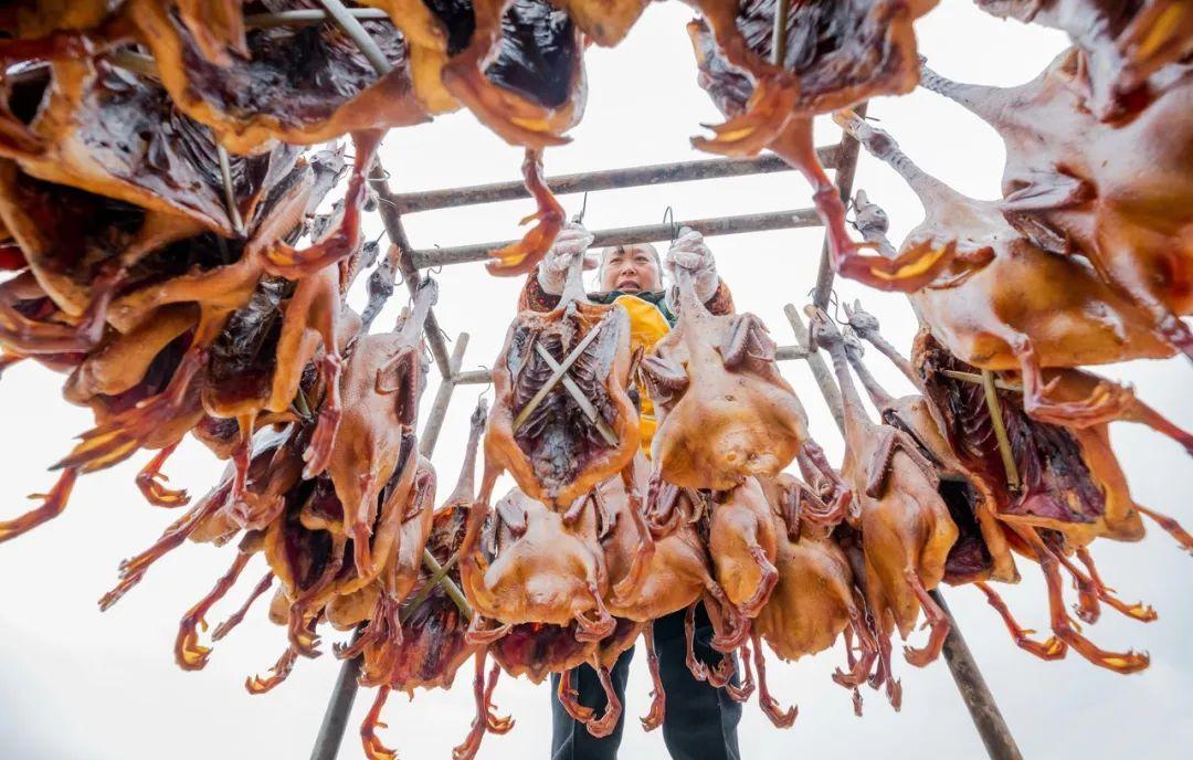 隆冬时节的珠玑古巷,昂首望去,两边屋檐下都晾着金黄色的、泛着油光的珠玑腊鸭。买回来后无论是清蒸仍是酸笋焖烧,滋味都是极其浓重。