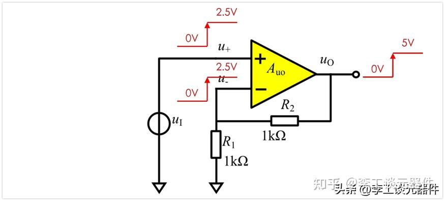 假设刚起头时,遍地电阻为0,突然u1霎时从0变成2.5V,即便uo一起头为0V,按照“虚断”,u-没有电阻流入放大器,所以u-为uo在R1和R2上的分压,仍然为0V。