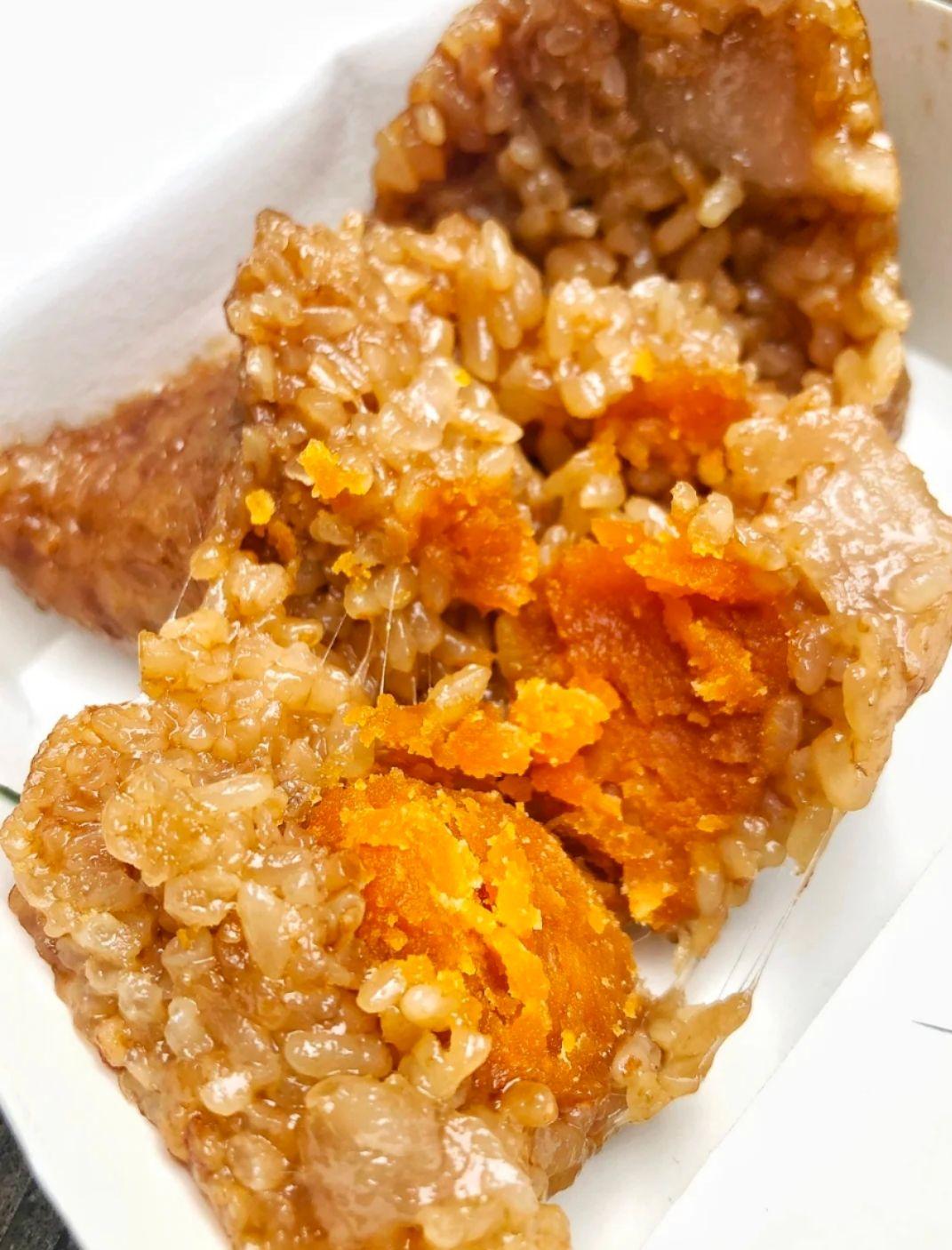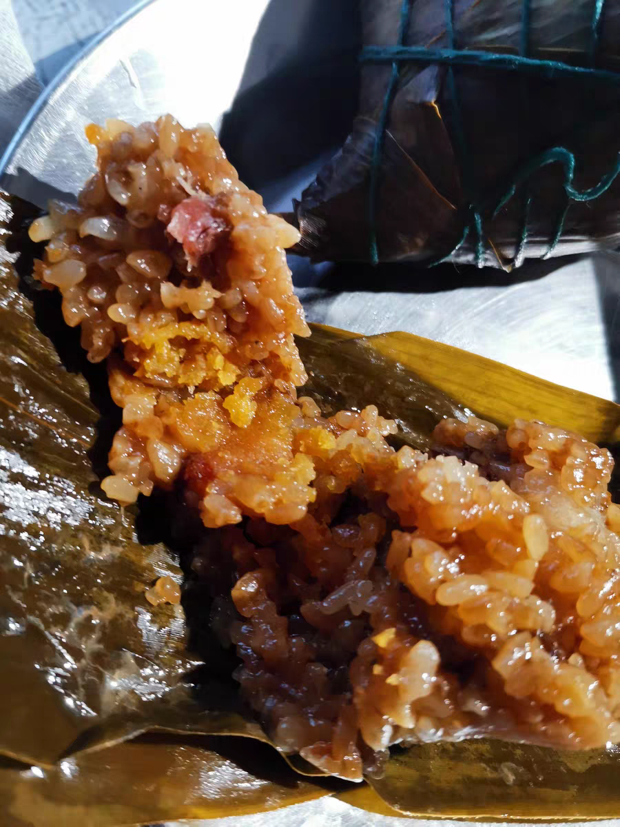 鸡蛋肉粽,米饭被鱼肉和肉浸染得金黄方程的!色泽非常诱人,肉肥瘦相间,咸鸭鸡蛋也是大颗的。将米饭、肉与咸鸡蛋一同送入口中,不油爽口,色泽太冷艳啦!