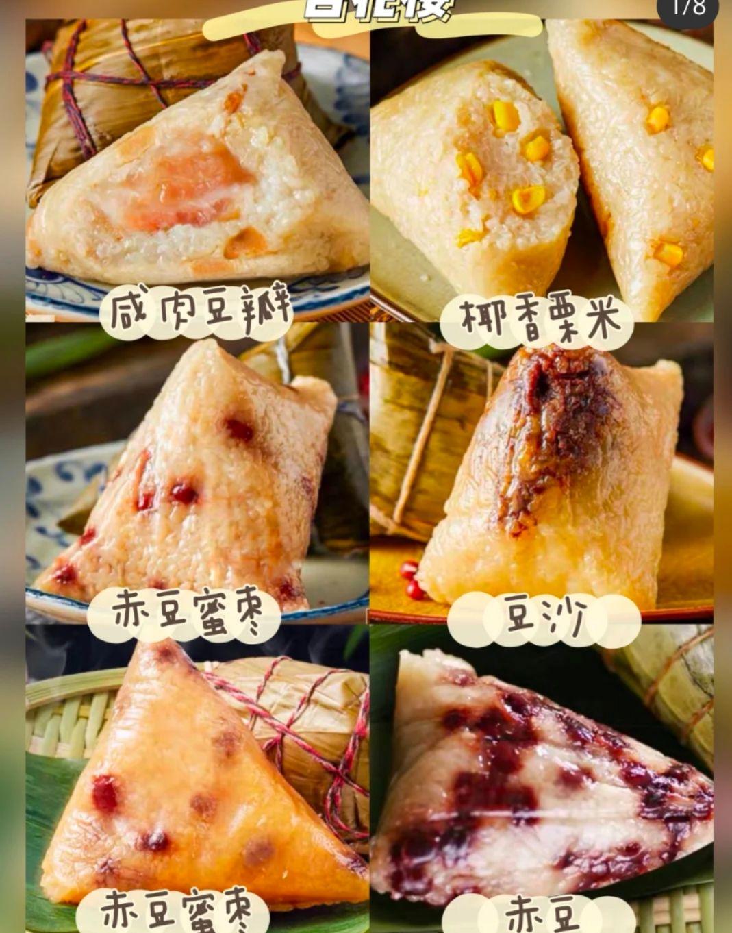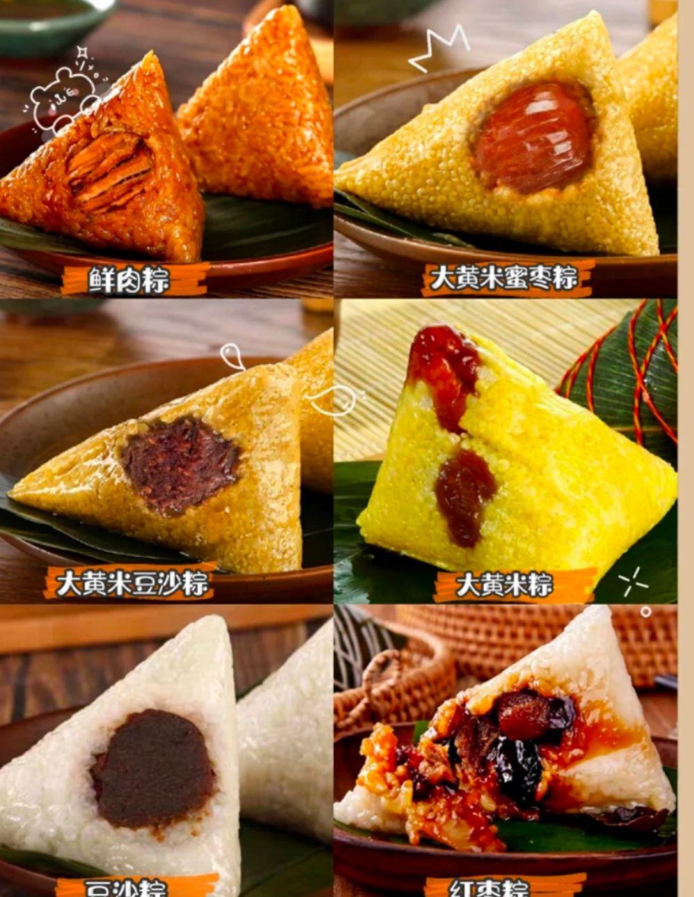 香糯黑胡椒粽 / 艾麻三宝粽 / 润香红豆粽 / 飘爽口豆粽 / 白糯沙粒粽 / 绿豆米绿豆核桃粽/ 流心糖果粽