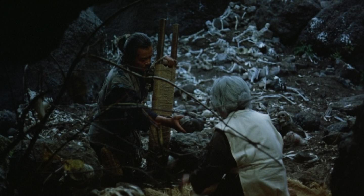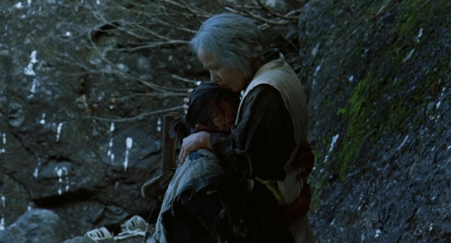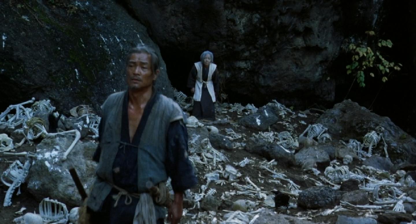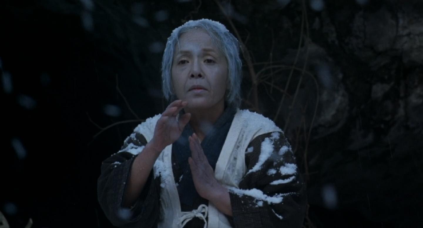 阿珍在盘坐在白骨丛中,挥手让儿子离去。楢山纷繁扬扬的大雪落下,阿珍如佛般坐化,安静驱逐灭亡。