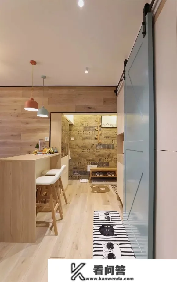 操纵过道上与卫生间的门槛,设置了摆布两个吊挂柜,削减了吊挂内部空间。淡蓝色的谷仓门,便利耐用,富有个性。