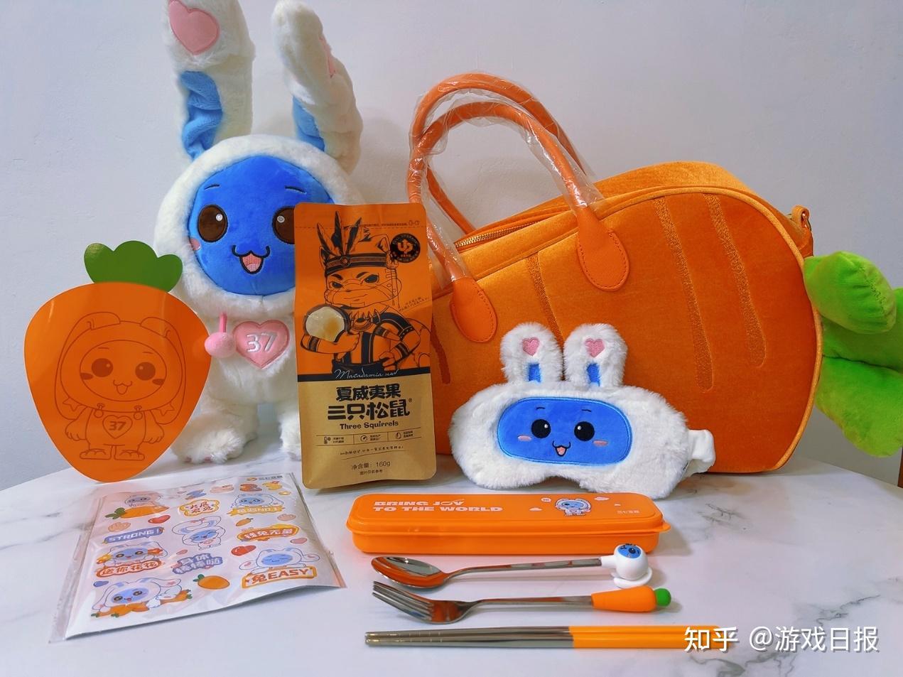 三七互余2023年新年月饼中包容了两个胡萝卜包、洋葱头小鸡玩偶、一副餐具、贴纸和一袋坚果。