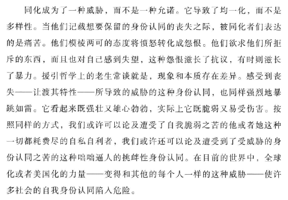 同化成为了一种威胁,而不是一种许诺。它招致了均一化,而不是多样性。当他们记载想要保留的身份认同的丧失之际,被同化者们表达的是痛苦。他们含糊其词的立场将愤慨转化成怨恨。他们欲求他们所拒份认同之苦的那种不可一世的搬弄性身份认同。在目前的世界中,全球化或者美国化的力量一变得和其他的每小我一样的那种威胁一使许多社会的自我身份认同陷入危险。类似或反复是一种恶的美学我晓得题主的意思是信息或资本的足够灵通能否可以消弭抵触。