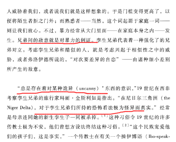 兄弟的敌意就是对暴力的例证。孪生兄弟代表着一种强化了的兄弟对立。考虑孪生兄弟和酷似的人,就是考虑鼓起于类似性之中的威胁,或者如弗洛伊德所说的,“对次要差别的自恋”——有诸种藐小不同所产生的敌意。