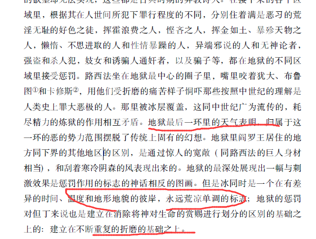 天堂最初一环里的气候表白,归属于那一环的恶的权力范畴脱节了传统上固有的梦想。天堂里阎罗王栖身的处所同下界的其他地域的区别,是通过惊人的宽阔( 同路西法的巨人身段相当) ,和刮着冰冷阴沉的风表示出来的。天堂的最深处展示出一夫与 *** 效果是赏罚感化的标记的神话相反的丹青。但是冰同时是一个在有差别的时间、温度和地形地貌的彼岸,永久荒凉单调的标记; 天堂的赏罚对但丁来说也是成立在消弭将神对生命的恩赐停止划分的区此外根底之上的: 成立在不竭反复的熬煎的根底之上。我们当然不克不及武断地认为恶就是抵触,但是恶地、恶行、恶者与抵触是陪伴的。