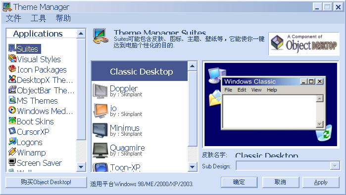 ThemeManager2.10界面图(自http://www.my *** th.net/nForum/#!article/Desktop/13051。2004年)——与官网新版看起来完全纷歧样5、第三方shell——嫌弃explorer.exe痴肥、不自在、容易失去响应,于是利用第三方shell来取而代之,办理桌面图标、法式切换、使命栏和文件夹窗口。那类法式本意不在美化,但是跳出explorer.exe窠臼后,天然而然有新的标的目的,给人“个性化”的觉得。