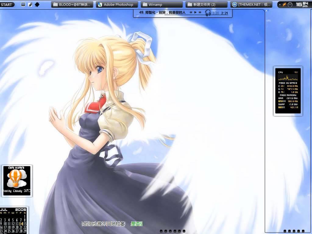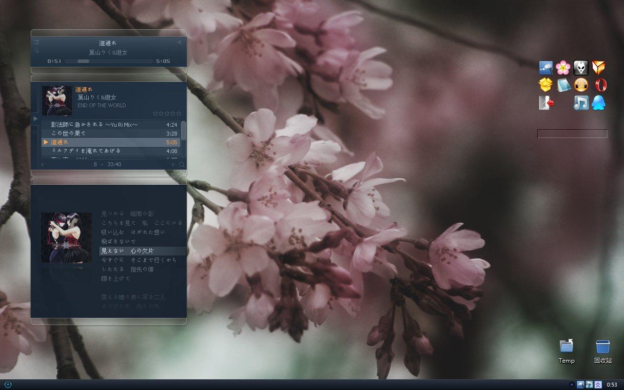 LiteStep自DeviantArt(名称是Sola by Slifer2006)(左下音乐信息来自CD Art Display;CAD右边的托盘东西栏来自Rocketdock;窗口通明效果来自TrueTransparency):