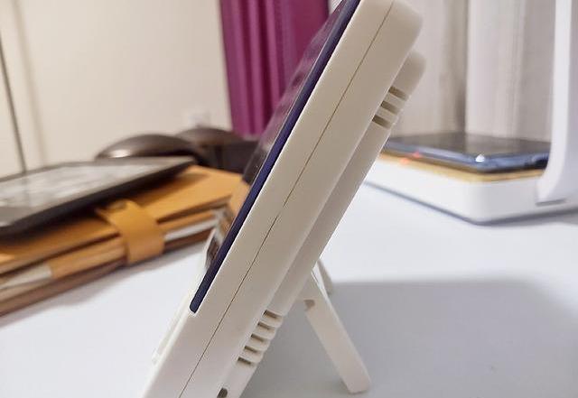 自带收架,翻开后在桌面上放置很安定,也能通过背后的挂口将它挂在墙面上。
