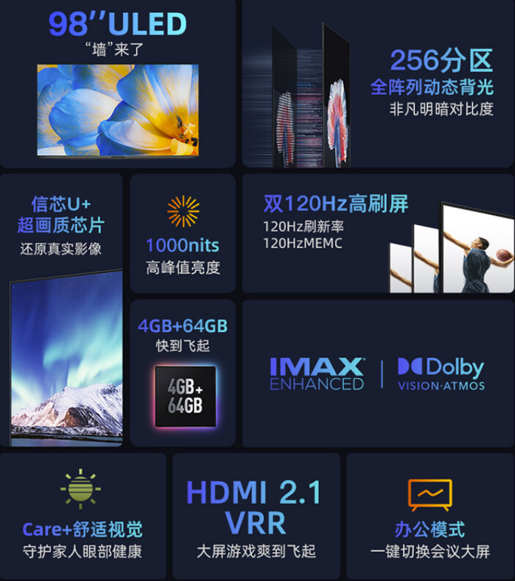 同时U7H拥有1000nit更大值光度,达至HDR萤幕尺度,可以呈现出亮部通透、黑色地道、条理细节丰硕的高量镜头。