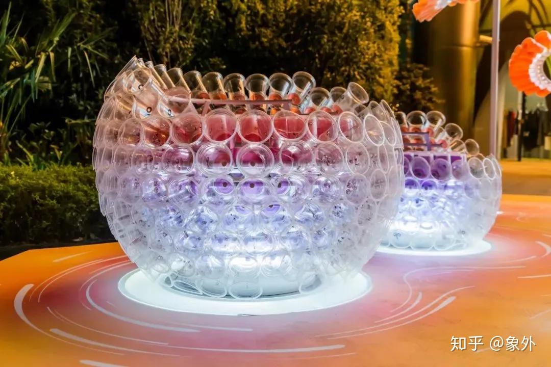 用上千个从社区商户收受接管的塑胶杯子营造出霓虹荡漾,浮沉回转的奇奥气氛。