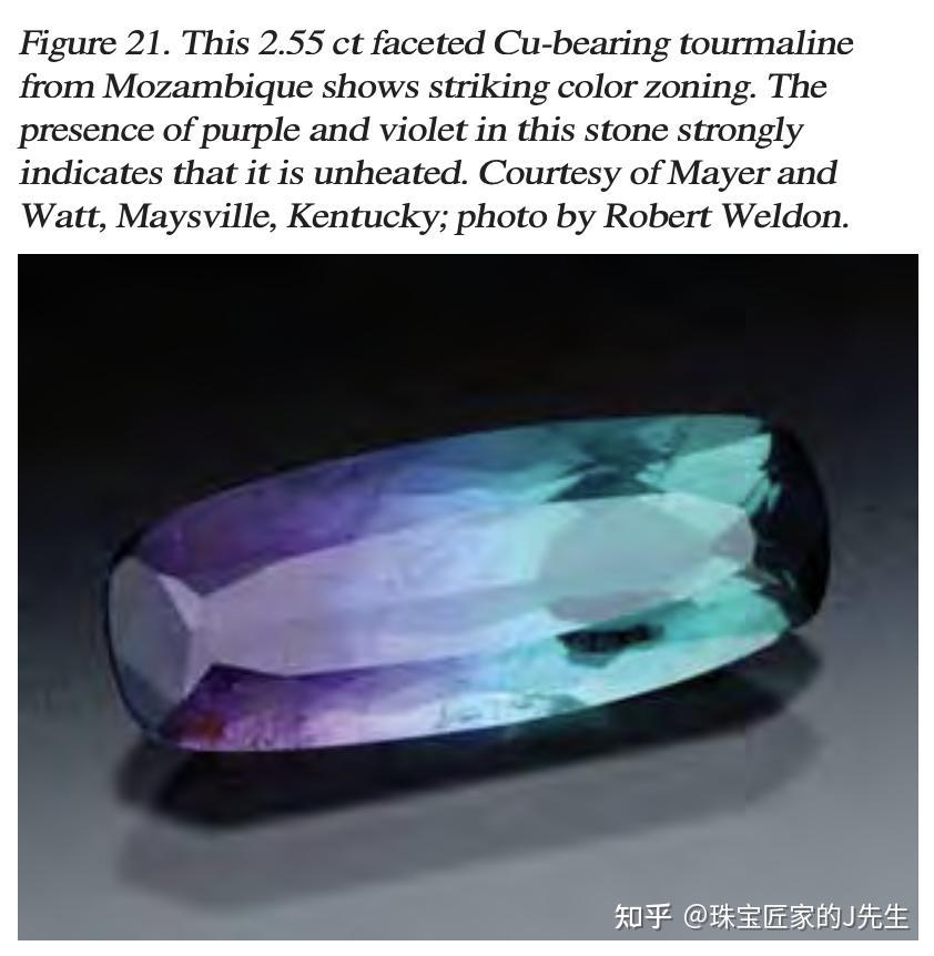 莫桑比克无烧帕拉伊巴 | 图源:GIA即便市场对蓝绿配色的逃捧,商家一般会通过热处置将三价锰降为二价,消弭紫调,凸显蓝绿调。