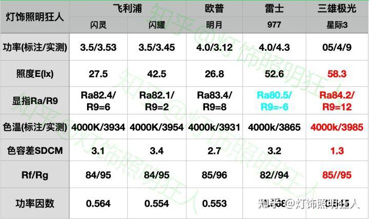色温不建议高于4000K,色容差<5SDCM显指Ra应>80 ,R9>0色彩饱和度/颜色传神度80<Rg/Rf<100无可视频闪,以豁免级更佳,频次大于3125HZ(最不需要关心,根本上已标配)所以我在给各人保举郁滞的时候根本上城市实测参数,如右图右图▼