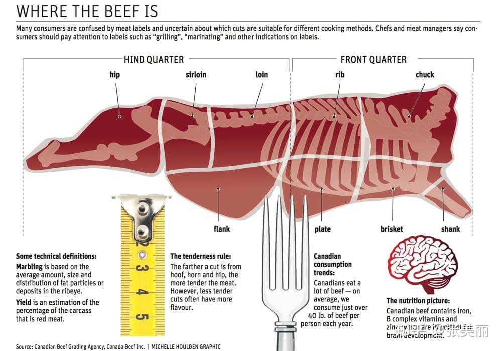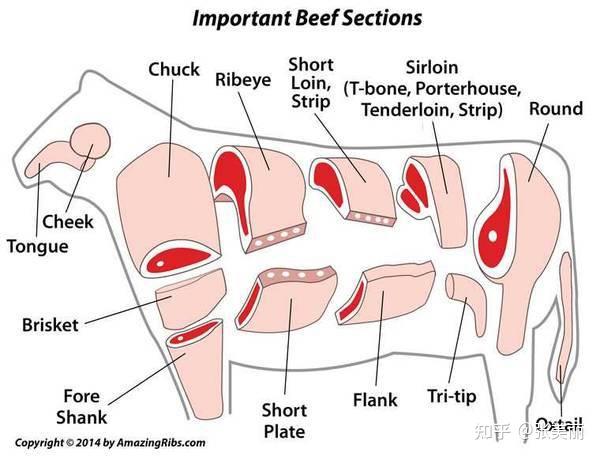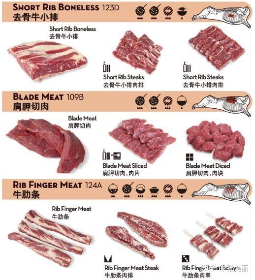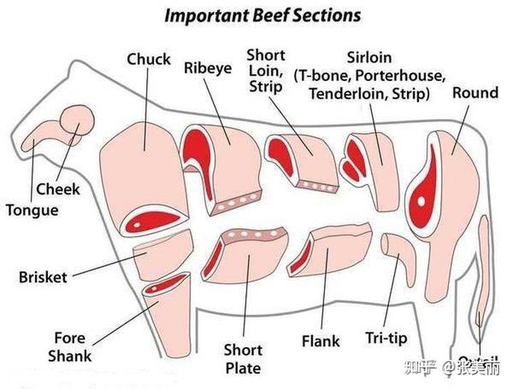 Chuck肩胛Rib肋脊Loin、Sirloin腰脊Hip臀部 Shank腿部Brisket前胸Plate胸腹Flank胁腹此中