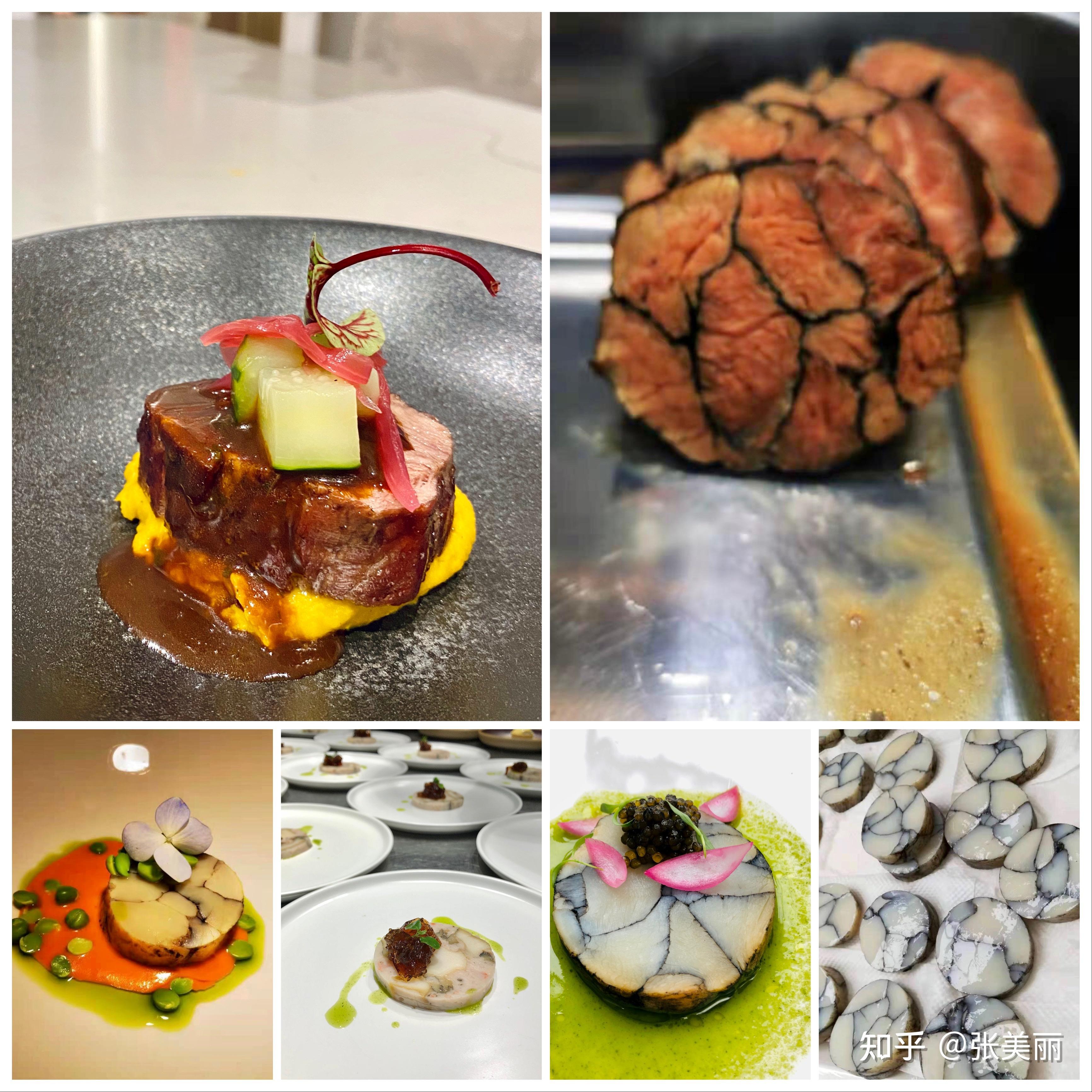 我们有时候做私家宴会,会用到很多分子料理的手段处置食材,从头组合食材的口感、味道、颜色。而我们操做的时候会用到少量的TG酶,把小块的肉粘合起来,定型冷藏后,通过低温慢煮,再煎造切片即可得到以上呈现大理石外形纹路的形态。