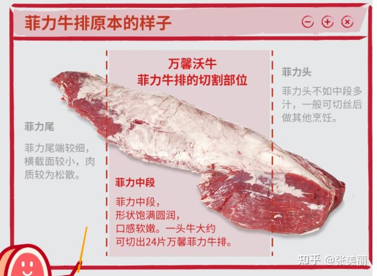 点击看高清牛排部位大图C.菲力Fillet,牛排保举位于牛只后腰脊内侧,是一头牛身上更高贵、最瘦、也是最嫩的部位,带有少少脂肪。