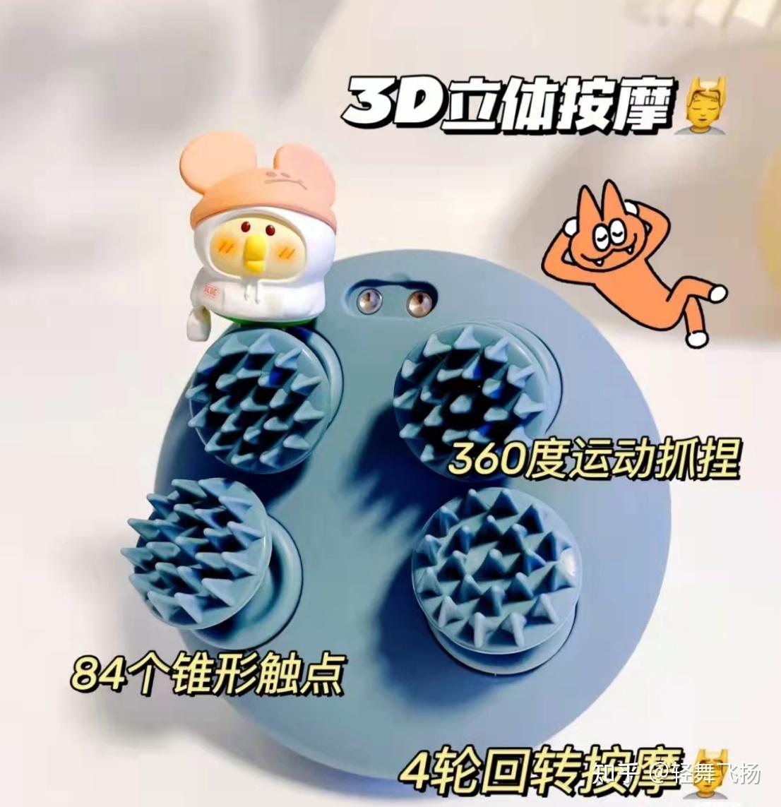 蓝宝头部推拿器,八爪鱼外型四个小爪84个穴位触电,几乎不要太恬逸,3D立体推拿,仿实推拿,并且接纳柔嫩的硅胶,不会有什么不适感,推拿的也十分全面!