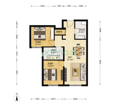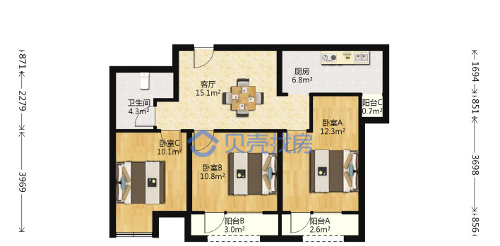 大宅3:浴室B在客厅A,浴室A占空中积5.7平。浴室B占空中积3.7平。