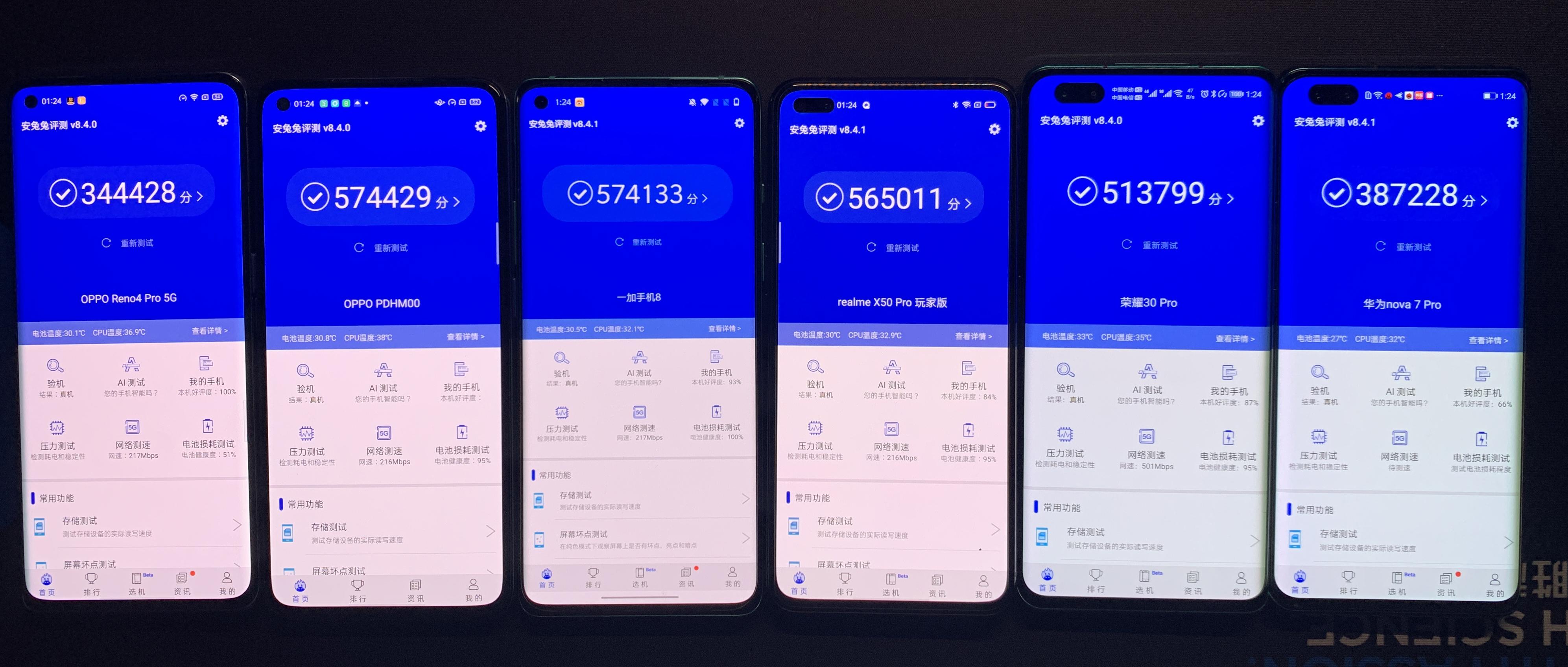 从左到右是OPPO Reno4 Pro、OPPO ACE 2、N80H58Vc 8、realme X50Pro玩家版、王者30 Pro、宏碁nova7 Pro。