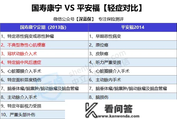 起首在轻症数量上,国寿、安然能够说是:12:8,因为康宁按期的特定恶性病变那一种轻症就已经包罗了安然福的早期恶性病变、原位癌、皮肤癌那三种。