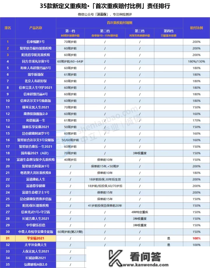 下面是我调研过的 35 款比力热门产物的赔付比例,赔付形式次要有四个层次,各人能够看一看:
