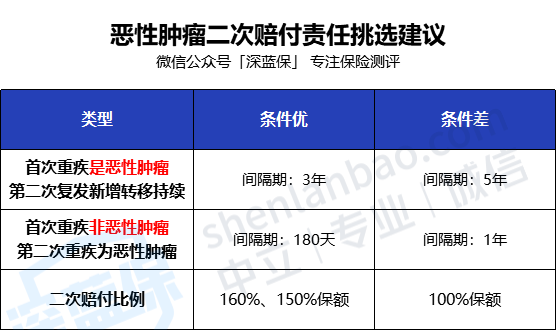 初次重疾为非恶性肿瘤(如心脑血管疾病),第二次赔付癌症的间隔期180天要比1年愈加容易理赔。