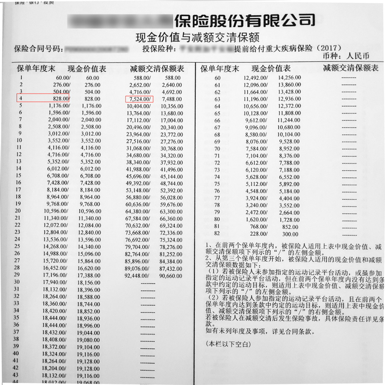 若是选择减额交清,第 4 年的现金价值 828 元充任剩余 26 年的保费,往后就不消交费了,但保额只要 7524 元,以后万一出险就只能赔 7524 元。