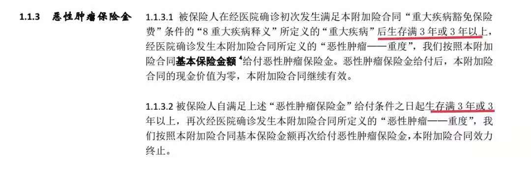 但安然福2021比力奇葩,因为它初次重疾无论是恶性肿瘤仍是非恶性肿瘤,第二次赔付的间隔期都是 3 年。