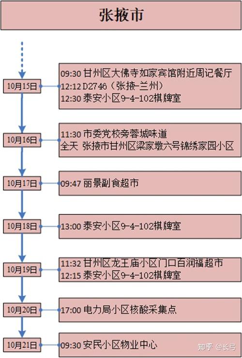 10月14日8:20兰州阳性病例张某一行6人,从内蒙古额济纳旗桐楠阁吃完早餐后自驾车辆抵达张掖旅游(轨迹已公布);10月15日早上9:59一行6人步行至甘州区县府街周记 *** 餐厅(县府街80号)吃早餐,期间该病例正在上班。