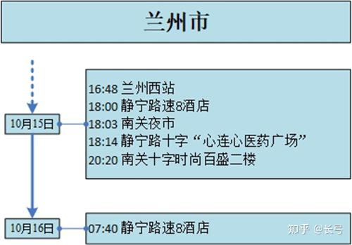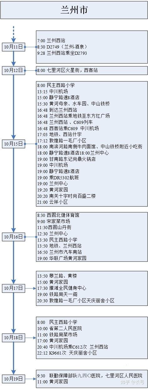 10月11日至10月15日外出轨迹与病例1不异。16:48抵达兰州西客站;17:00-17:15出站后打车回雁北街道天庆丽舍小区家中,当晚再未外出。