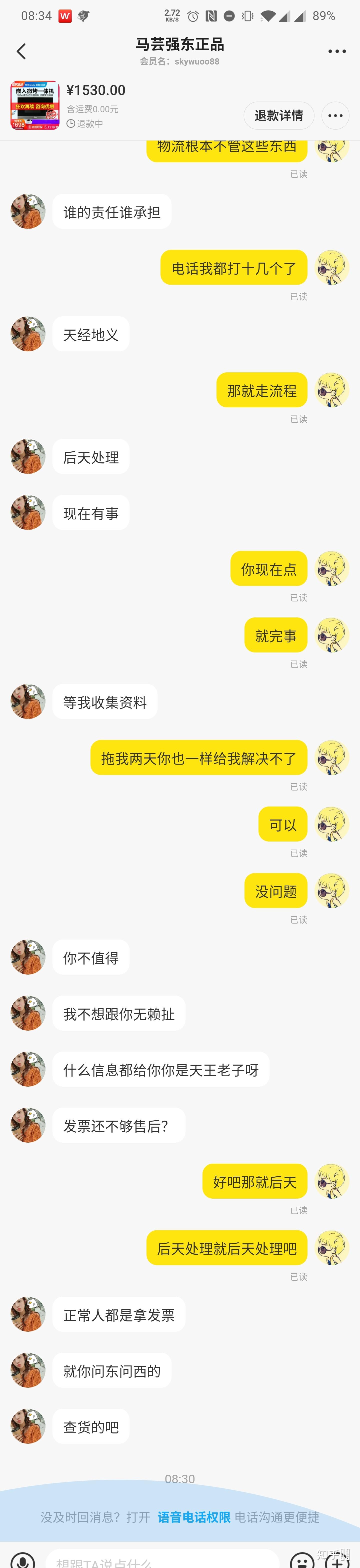 出格留意时间,16号是求能时间,15号在供给虚假克雷皮县,或是拖时间只供给仓储代售处。“后台弄”“我催着呢”“等下他上班了回我”,三个话术罢了为了僵持到16号主动求能时间,让买主不倡议退款。末于在主动求能之前倡议退款后,店家竟然起头问买主:有其他处理法子没?让我跟售后办事说买太久了,让五感售后办事处置。想间接把责任转嫁到五感售后办事身上本身卷钱走人。